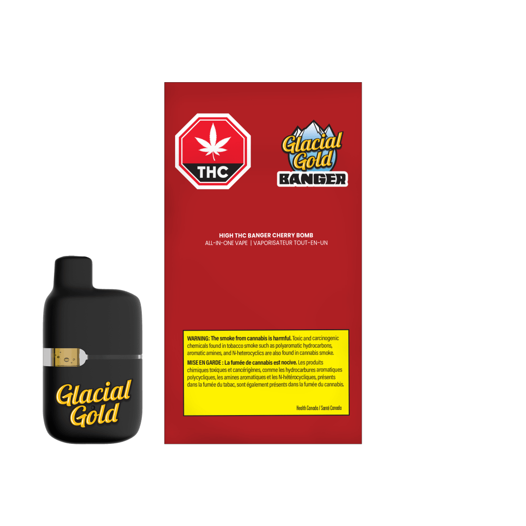 Glacial Gold HIGH THC Banger Cherry Bomb AIO 1g is a high-potency distillate all-in-one device with a classic cherry bomb botanical profile that will have you begging for more. The HIGH THC Banger device is discreet, easy to use, and features a sleek, portable design that fits comfortably in your pocket or palm.
