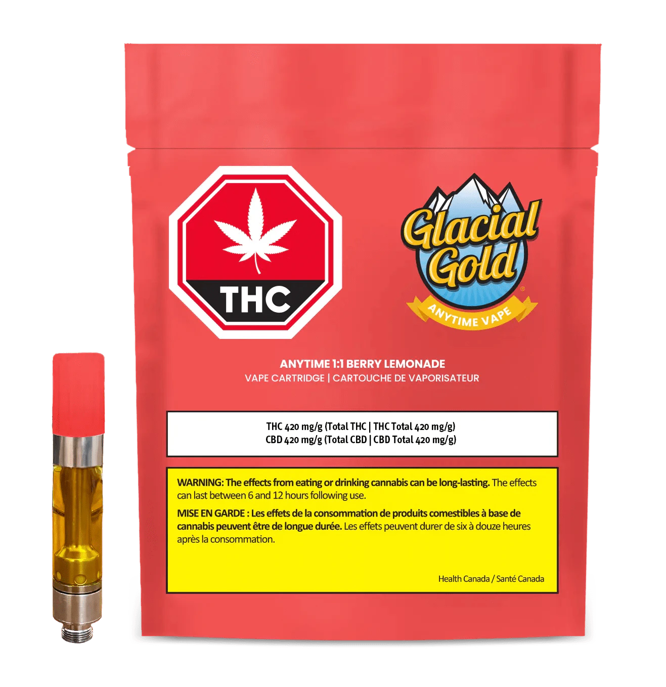 Anytime 1:1 Vape is a balanced CBD and THC profile for new and experienced consumers. Berry Lemonade is inspired by fresh-picked berries and citrus terpenes found in cannabis. The mild botanical terpenes are naturally derived from plant compounds, nothing artificial, and no additives (PG/VG). Glacial Gold distillate is processed through a patented closed loop, chilled-alcohol extraction method. Cartridges are made with stainless steel components and a ceramic atomizer.