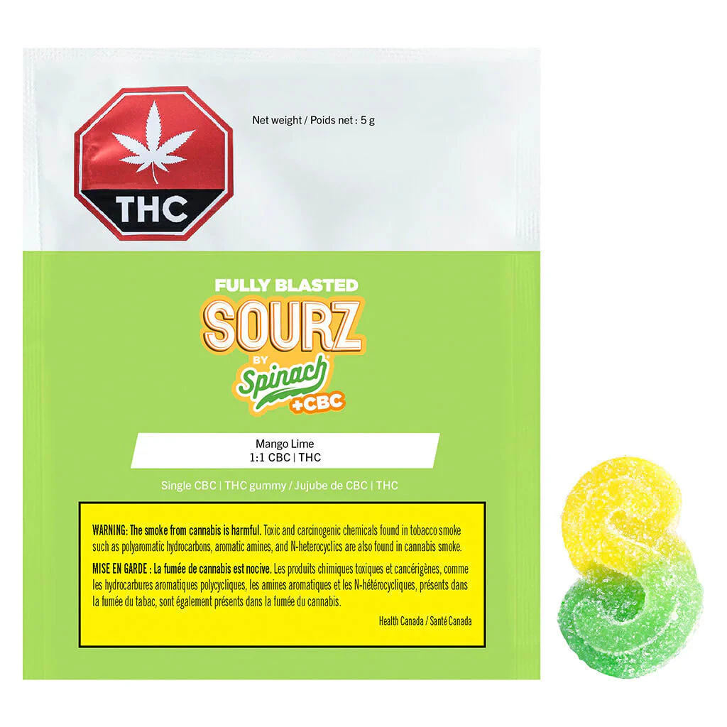 Prepare for blast off! SOURZ by Spinach Fully Blasted Mango Lime 1:1 CBC | THC gummies feature a combination of tropical mango and tangy lime flavours. With a balanced blend of 10mg THC and 10mg CBC per piece, brighten your day and immerse yourself in a clear and uplifting high. This dual-flavoured gummy is over-the-top with natural flavours and blasted with sour crystals. Enjoy 1 gummy per pack, 10mg THC total and 10mg CBC total.